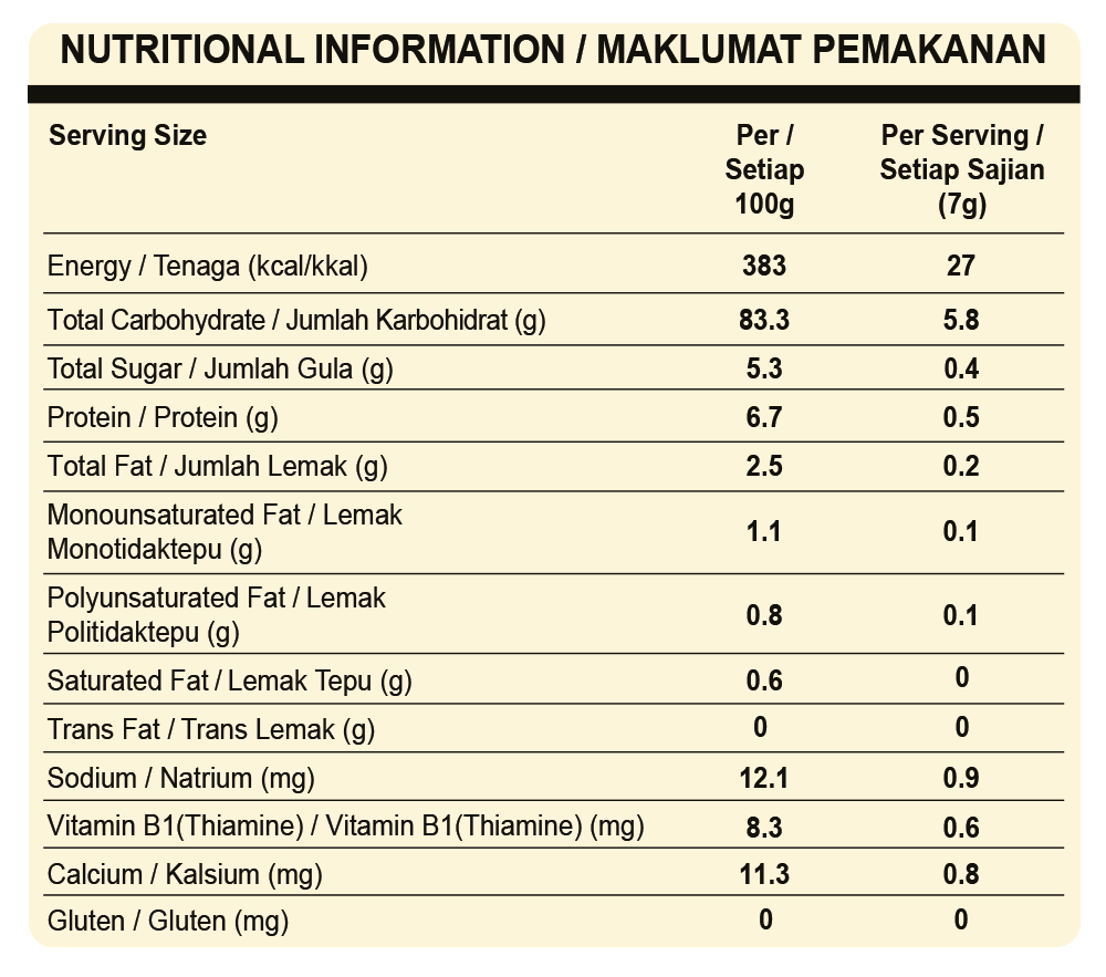 Organic Japonica White Rice (59.91%) , Organic Japonica Brown Rice (23.11%), Organic Brown Sugar (6.85%), Organic Apple Juice Concentrate (3.71%), Natural Pearl Black Rice (2.57%), Yogurt Powder (2.14%), Organic Banana Powder (1.71%), Vitamin B1 (0.001%)