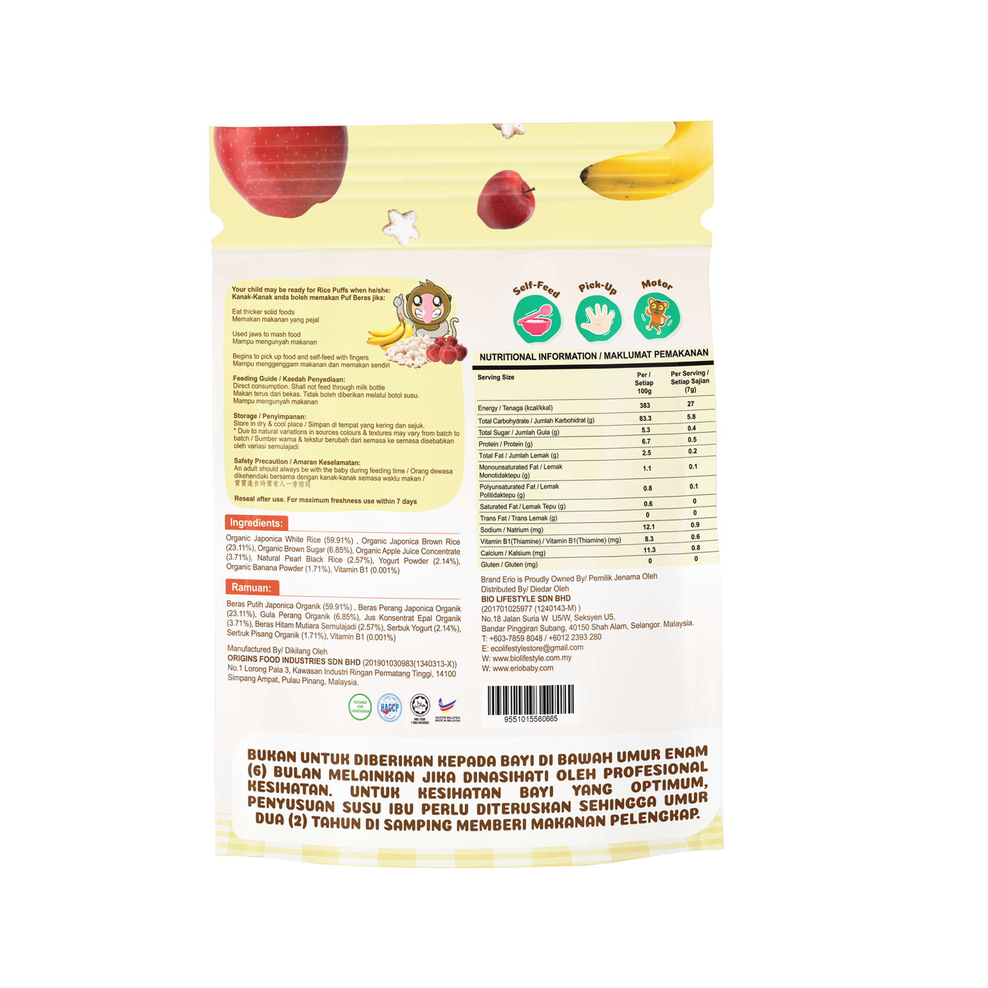 Organic Japonica White Rice (59.91%) , Organic Japonica Brown Rice (23.11%), Organic Brown Sugar (6.85%), Organic Apple Juice Concentrate (3.71%), Natural Pearl Black Rice (2.57%), Yogurt Powder (2.14%), Organic Banana Powder (1.71%), Vitamin B1 (0.001%)