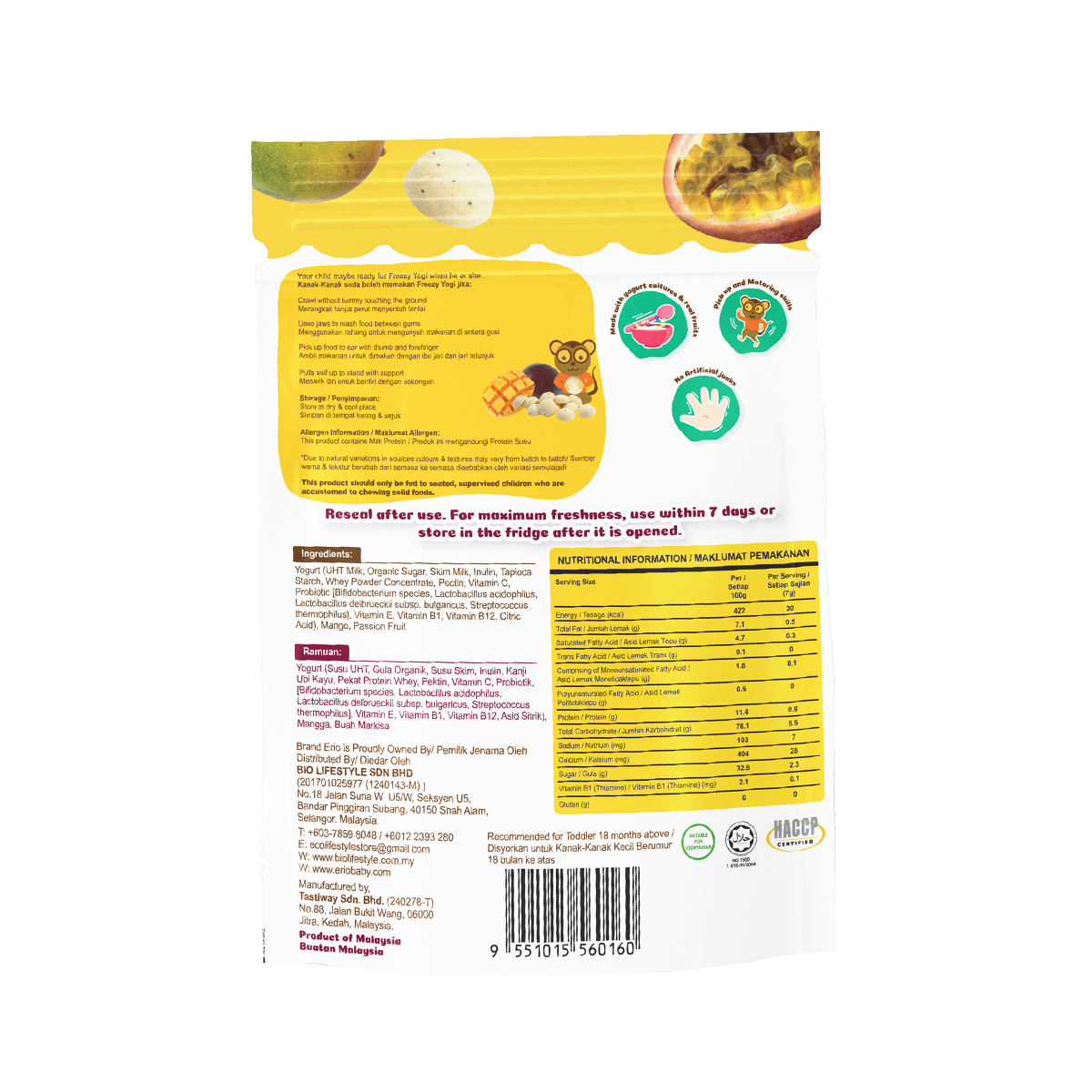 Yogurt (UHT Milk, Organic Sugar, Skim Milk, Inulin, Tapioca Starch, Whey Powder Concentrate, Pectin, Vitamin C, Probiotic [Bifidobacterium species, Lactobacillus acidophilus, Lactobacillus delbrueckii subsp, bulgaricus, Streptococcus thermphilus], Vitamin E, Vitamin B1, Vitamin B12, Citric Acid), Mango, Passion Fruit