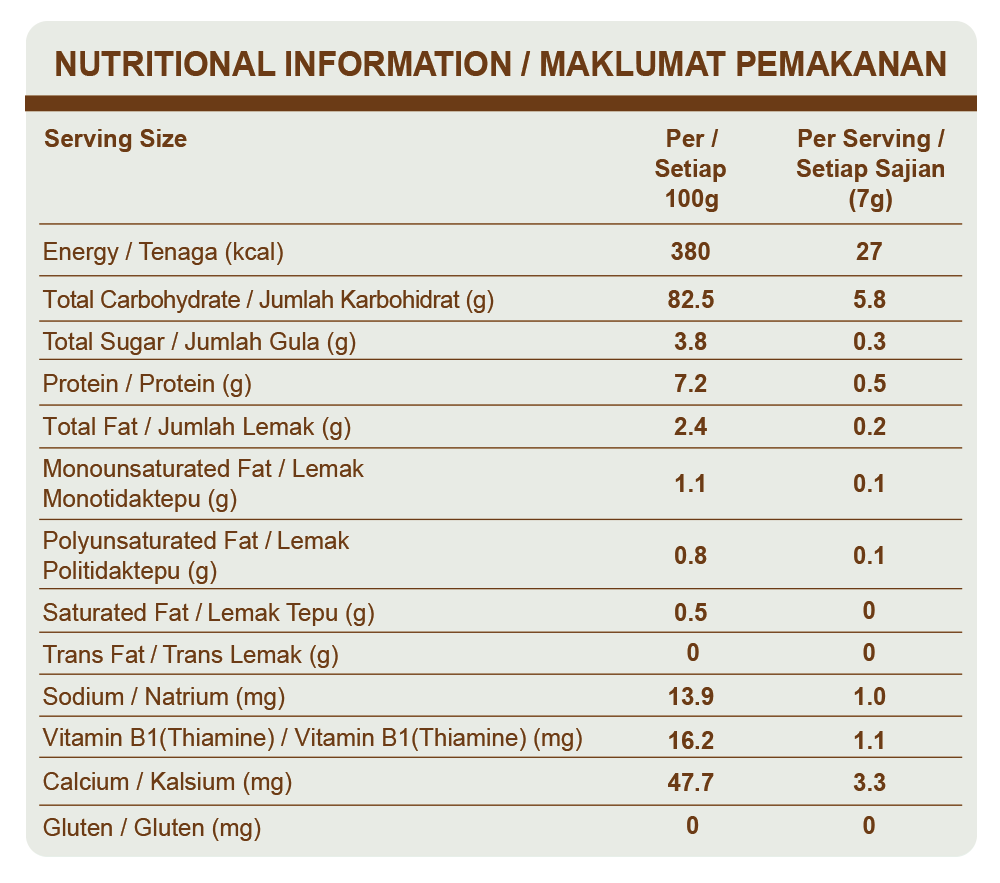 Organic Japonica White Rice (62.69%), Organic Japonica Brown Rice (24.18%), Organic Apple Juice Concentrate (7.46%), Natrual Pearl Black Rice (2.69%), Organic Kale Powder (2.39%), Spinach Powder (0.60%), Vitamin B1 (0.001%)