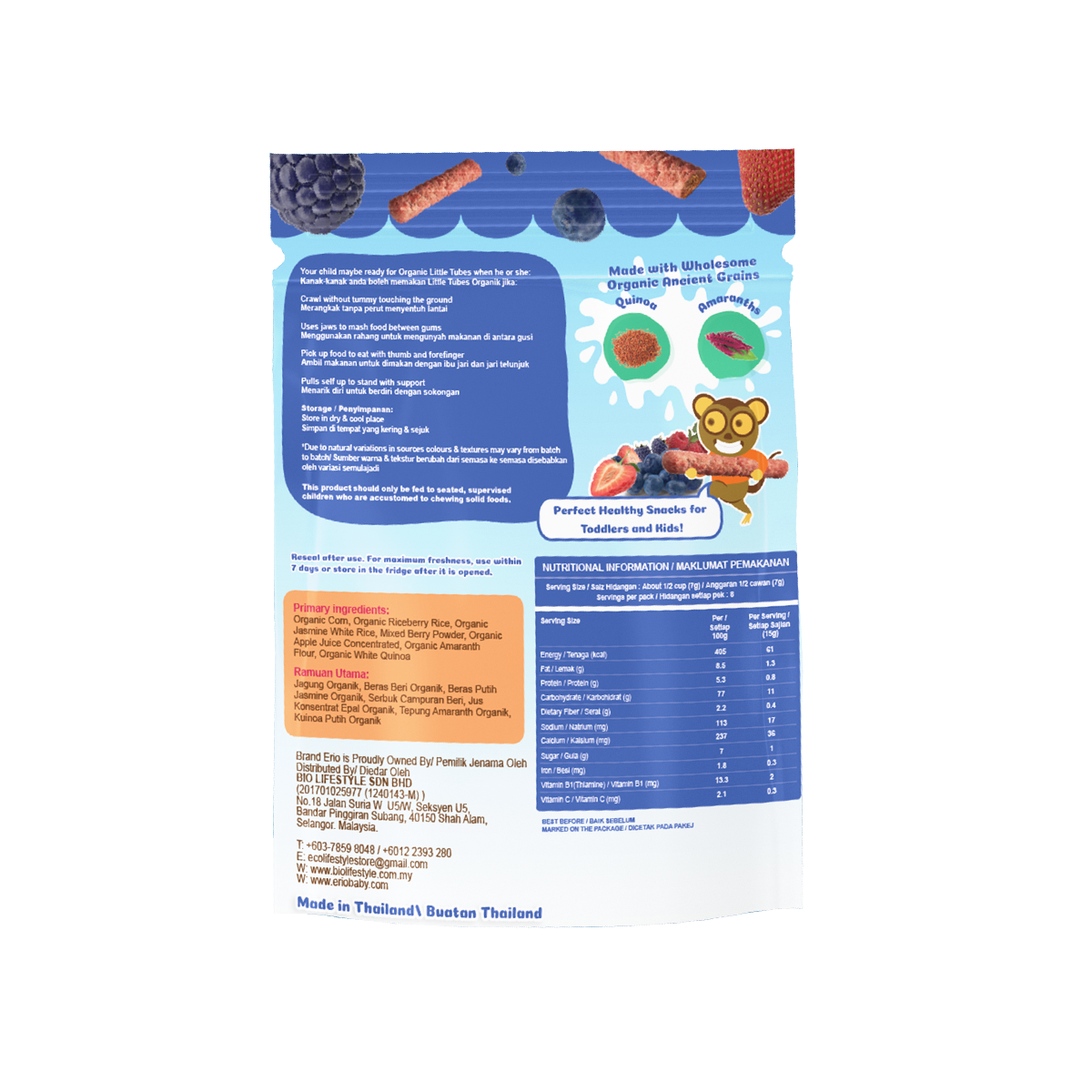 Introduce your little one to a deliciously healthy snack with Little Tubes! Made from organic, wholesome Ancient Grains, these bite-sized snacks are crafted to fuel your child’s growth and development. With a perfect blend of taste and nutrition, each tube is naturally sweetened with organic apple juice, ensuring no added sugars or salts.
