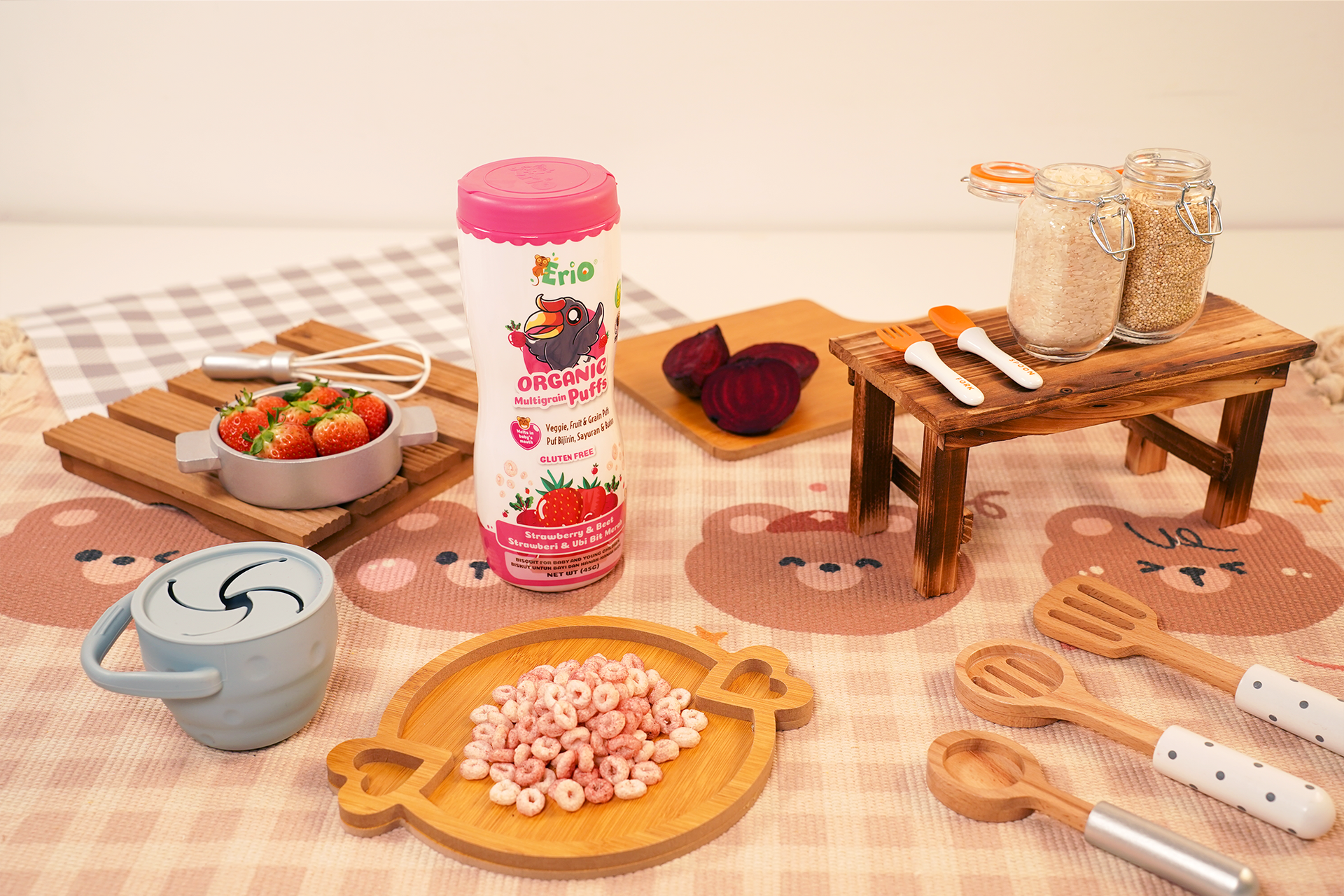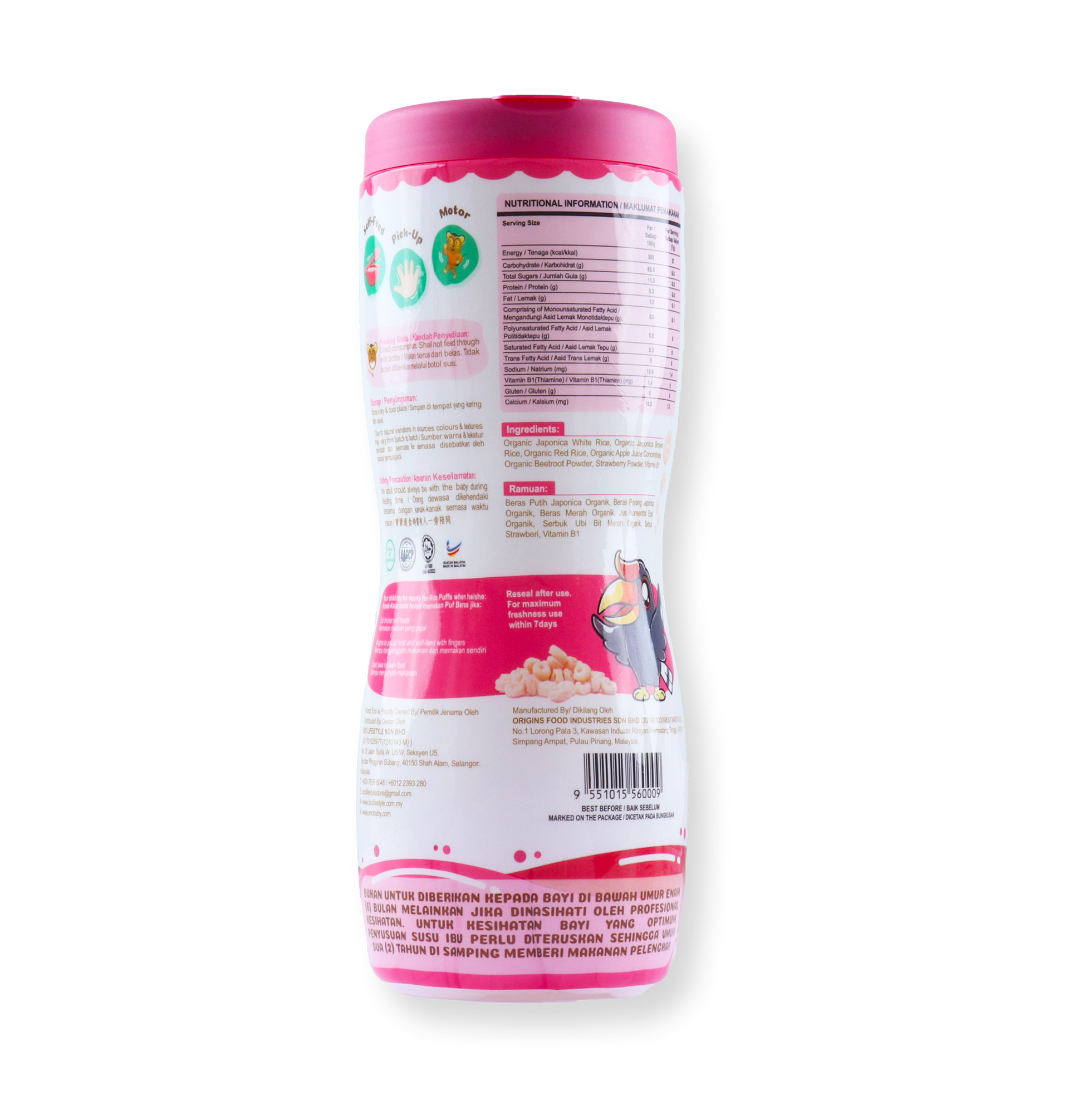 Organic Japonica White Rice, Organic Japonica Brown Rice, Organic Red Rice, Organic Apple Juice Concentrate, Organic Beetroot Powder, Strawberry Powder, Vitamin B1