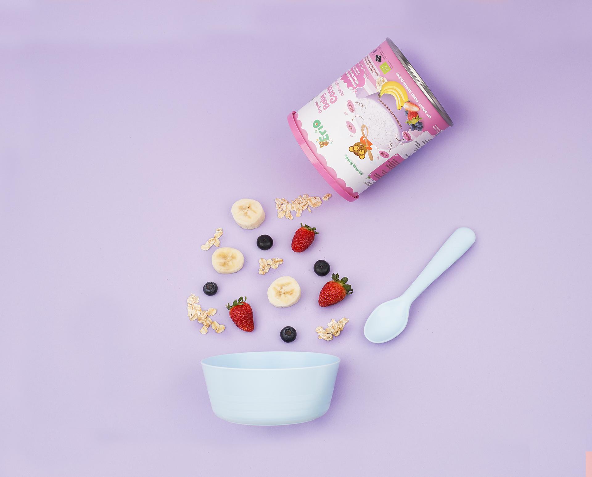 Organic Wholegrain Oat (80%), Organic Banana (10%), Organic Strawberry (5.8%), Organic Blueberry (4%), Organic Chias (0.198%), Vitamin B1 (0.002%)