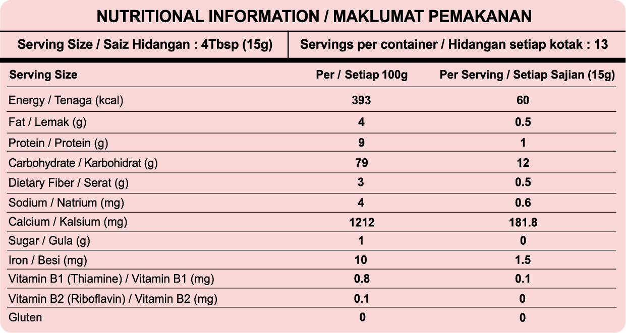 Organic Riceberry Rice (81%), Organic Quinoas (8%), Organic Amaranths (5%), Organic Millets (5.8%), Organic Chias (0.196%), Vitamin B1 (0.002%), Probiotics (Bacillus Coagulans GB1-30 6086) (0.002%)
