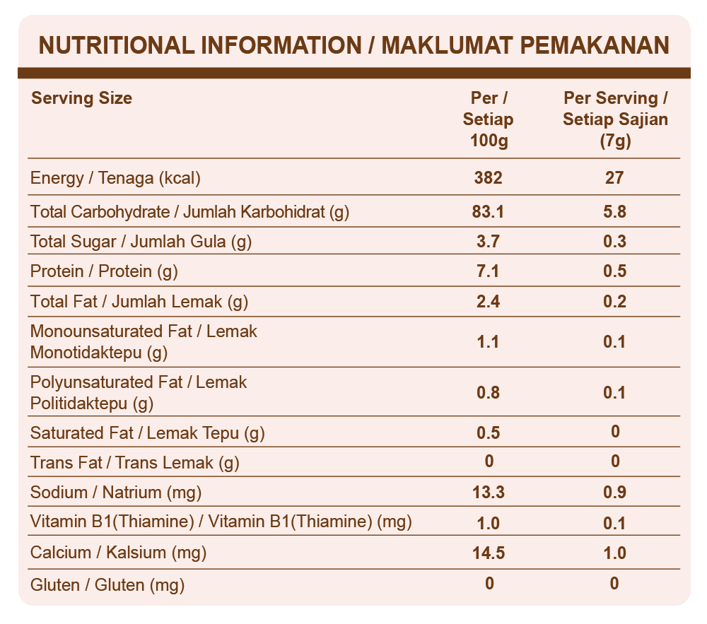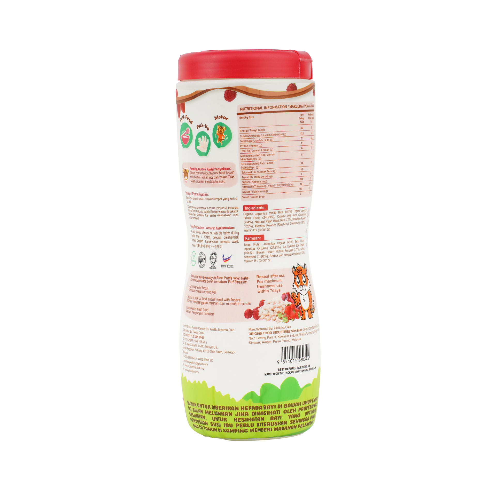 Organic Japonica White Rice (64.63%), Organic Japonica Brown Rice (24.93%), Organic Apple Juice Concentrate (5.54%), Natural Pearl Black Rice (2.77%), Strawberry Powder (1.20%), Berries Powder (Raspberry & Cranberries) (0.92%), Vitamin B1 (0.001%)