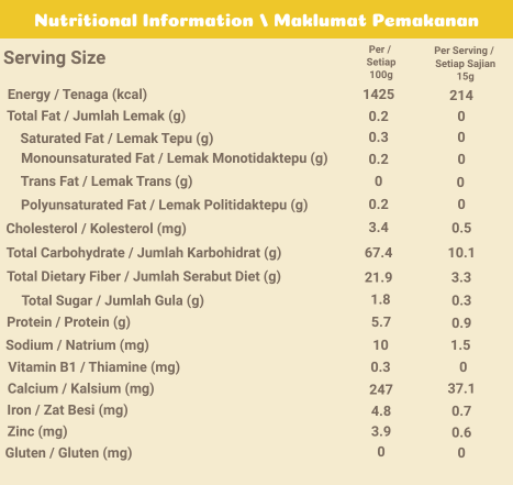 Rice (68.5%), Starch (16.27%), Concentrated Pear Juice (8.6%), Glutinous Rice Flour (3.4%), Banana Powder (1.7%), Apple Powder (0.17%), Nutrient 1 (Calcium Carbonate & Vitamin B1)(0.86%), Nutrient 2 (Zinc Gluconate & Iron Pyrophosphate)(0.5%)